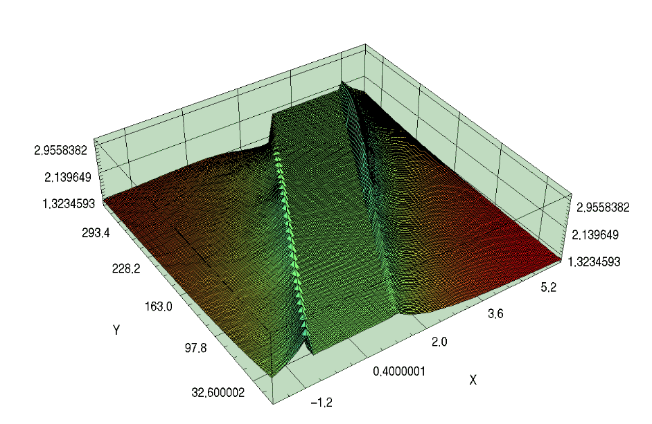The following shows a spacetime picture of g_rr versus time and z. The axis labelled X represents the z-axis and the axis labelled Y represents time in grid coordinates. The vertical axis is g_rr. The flat region in between is the excised region.